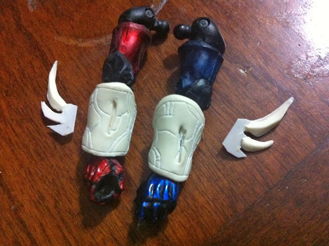 See photo below on the half formed blades and the crevice i made in the armor on the lower arm to allow the blade to be slotted into the arm later.